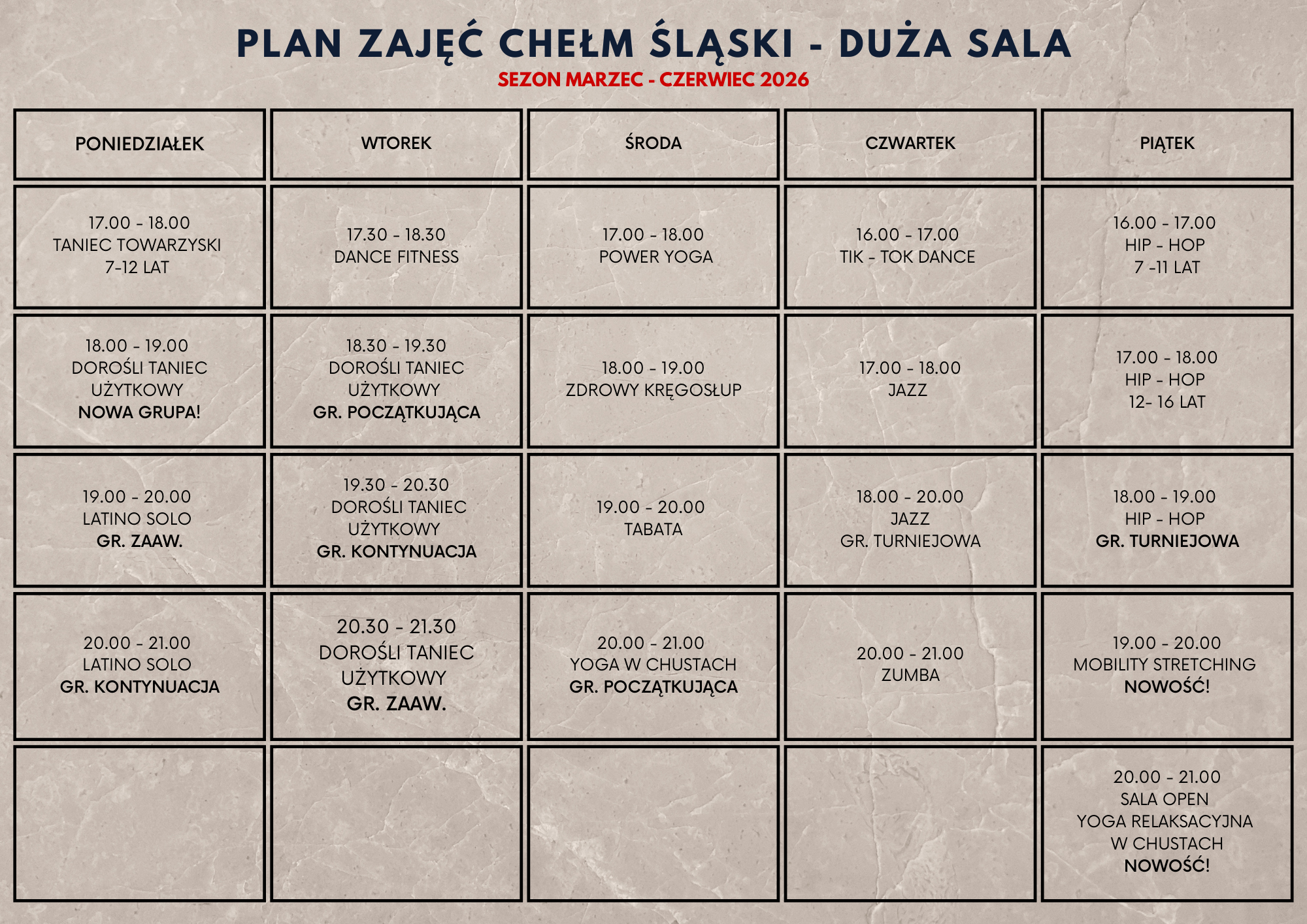 Dowiedz się więcejNOWOŚĆ! AKTYWNY SENIOR 💪✨ Ruch to najlepszy sposób na zdrowie i dobre samopoczucie w każdym wieku! Zapraszamy na zajęcia stworzone specjalnie dla seniorów, którzy chcą czuć się lepiej i mieć więcej energii na co dzień.